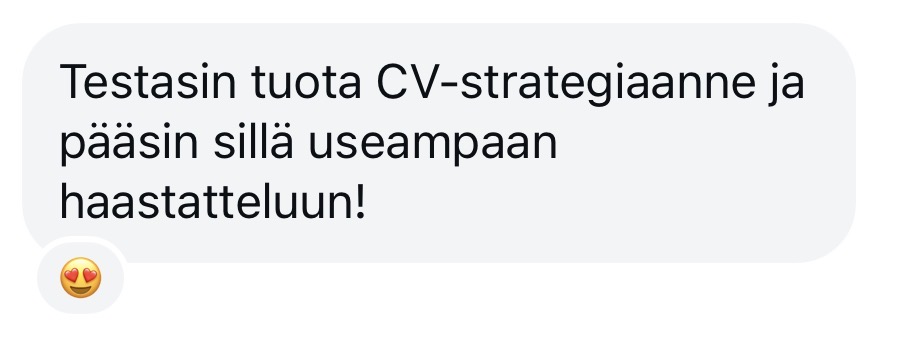 Asiakastarina: Asiakkaamme oli vasta aloittanut työnhaun ja muutamaan kuukauteen lähettänyt monia kymmeniä hakemuksia. Vastauksena oli vain hiljaisuus. Keskusteltuamme autoimme häntä ottamaan strategian käyttöön. ➡️ Lyhyessä ajassa hän alkoi päästä satojen hakijoiden joukosta haastatteluihin.